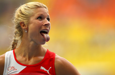 Linda Zublin of Switzerland reacts after competing in the Women's Heptathlon 100 metres hurdles during Day Three of the 14th IAAF World Athletics Championships Moscow 2013 at Luzhniki Stadium on August 12, 2013 in Moscow, Russia. (Getty Images)