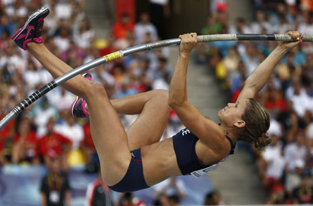 France's Marion Lotout competes during the women's pole vault event at the 2013 IAAF World Championships at the Luzhniki stadium in Moscow on August 11, 2013. (AFP)