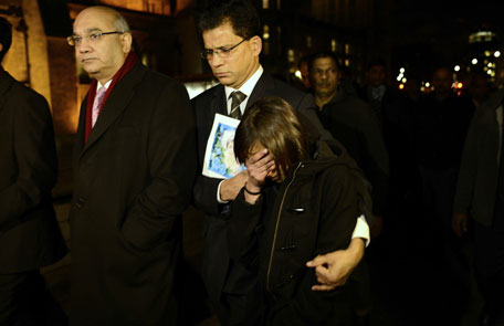 Lisha Barboza reacts as she stands with her father Ben while he holds a picture of his wife, nurse Jacintha Saldanha, as they leave the Houses of Parliament in London. (REUTERS)