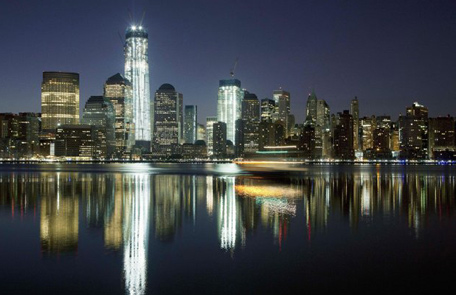 The twin reflecting pools, lower center, of the National September 11 Memorial are illuminated Sunday evening, April 1, 2012 at the World Trade Center in New York. One World Trade Center, center, is now up to 100 floors and will top out at 104 floors. (AP)