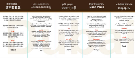 Eida has also provided Dubai residents with a brochure titled “Don’t Panic”, which is translated into nine languages, explaining the registration procedure.