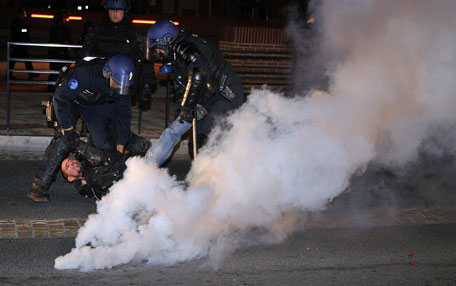 A photo taken on October 26, 2014 shows anti riot gendarmes clashing with opponents of the Sivens dam project during a protest in Gaillac in memory of the 21-year-old man who was discovered dead on the site of the dam. (AFP)