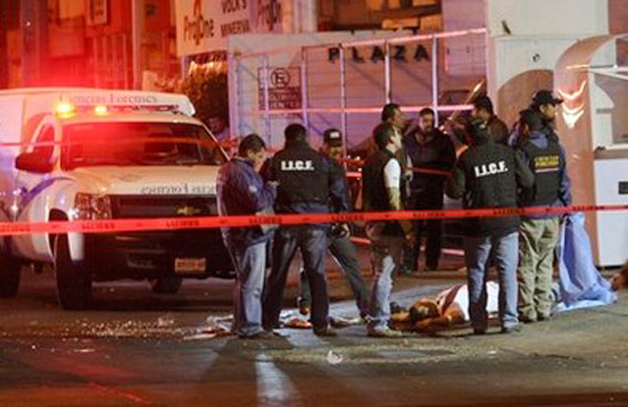 State police and forensic experts stand outside of a nightclub after gunmen opened fire and hurled a grenade in the western city of Guadalajara, Mexico, early Saturday. Six people were killed and at least 37 were injured. (AP)