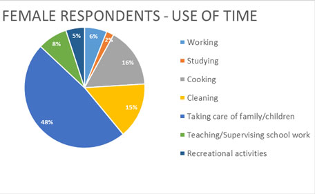 The survey explored the aspect of time used on key tasks among respondents, with the majority of their time taking care for family performing household chores such as cooking and cleaning.
