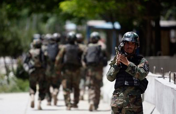 Afghan National Army soldiers arrive at the Kabul's main military hospital in Kabul, Afghanistan. The Afghan Defense Ministry says a suicide bomber blew himself up inside a tent filled with medical students eating lunch at a military hospital in Kabul Saturday, killing at least six people and wounding 23. (AP)