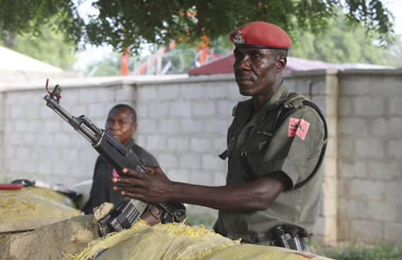 Police officers armed with AK-47 rifles stand guard at sandbagged bunkers along a major road in Maiduguri, Nigeria. The radical sect Boko Haram, which in August 2011 bombed the United Nations headquarters in Nigeria, is the gravest security threat to Africa's most populous nation and is gaining prominence. (AP)