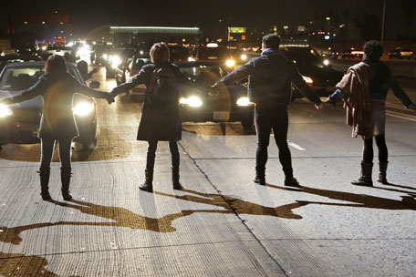Protesters block the southbound lanes of the 110 freeway after the Los Angeles County Coroner released an autopsy report on the LAPD's shooting of Ezell Ford in Los Angeles, California December 29, 2014. (Reuters)