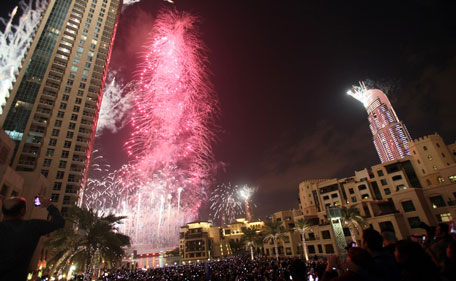 Explosions of colour shot out of the world's tallest building, Dubai's Burj Khalifa, illuminating the emirate's sky as the huge expatriate and tourist hub celebrated the New Year.