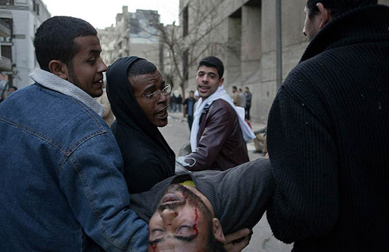 Egyptian demonstrators carry a wounded comrade shot by police during clashes near the central Tahrir square in Cairo. (AFP)
