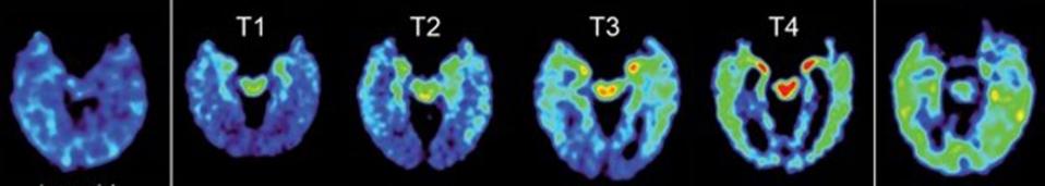From left, a normal brain scan, suspected Chronic Traumatic Encephalopathy (CTE) subjects, and a subject with Alzheimer's disease. (AP)