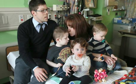 William and Sarah Cramer, of Mogadore, Ohio sit with their children, from left, Billy, 4, Delaney, 1, and Mason, 2, during a television interview after their wedding in Billy's hospital room at Akron Children's Hospital, in Akron, Ohio. (AP)