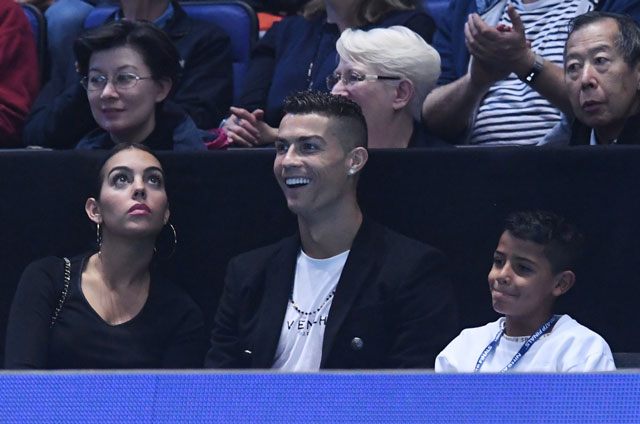 Cristiano Ronaldo sits with Georgina Rodriguez and his son Cristiano Jr as they watch the game between US player John Isner against Serbia's Novak Djokovic, during their men's singles round-robin match on day two of the ATP World Tour Finals tennis tournament at the O2 Arena in London, Britain, 12 November 2018.
