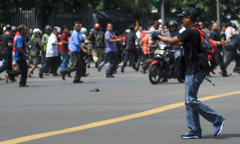 Plainclothes police aim their handguns towards suspects outside a cafe after a series of blasts hit the Indonesia capital Jakarta. (AFP)