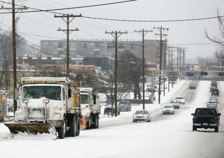 A department of transportation trucks plows the snow in Charlotte, North Carolina February 12, 2014. A deadly winter storm potentially more destructive than the one that paralyzed Atlanta just two weeks ago gripped the southern United States on Wednesday, crippling travel, knocking out power to more than 330,000 customers and encasing magnolia trees and palmetto fronds in ice. (REUTERS)