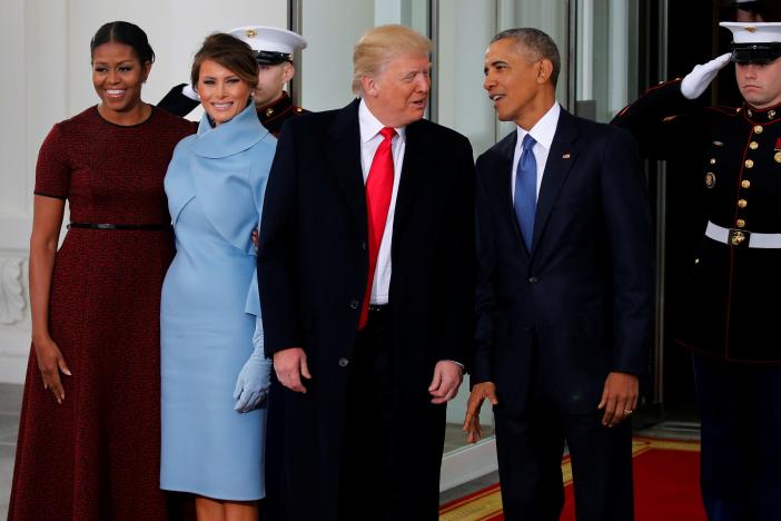 While Trump came to power bucking convention, he wrapped himself in the traditions that accompany the peaceful transfer of power. Following a morning church service with his family, Trump and his wife, Melania, had tea at the White House with Obama and outgoing first lady Michelle Obama.