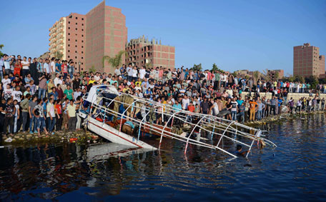 Relatives and onlookers gather on the bank of the Nile on July 23, 2015, north of the Egyptian capital Cairo, as the wreckage of a boat is pulled out of the water. The boat sunk when a cargo ship hit it, killing at least 18 people people celebrating an engagement aboard. Police said they had arrested the captain of the cargo boat and his deputy after the accident, one of many that happen on the Nile and off Egypt's coast each year. (AFP)