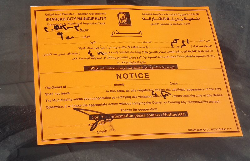 Sharjah Municipality officials have posted notices on all the used cars parked in the streets and is informing them about the negative impact of such vehicles on the aesthetic look of Sharjah.