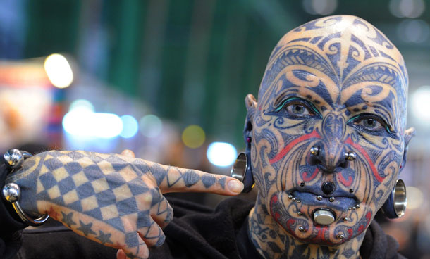 A man poses for photographers showing his tattoos during the 20th International Tattoo Convention. (AFP)