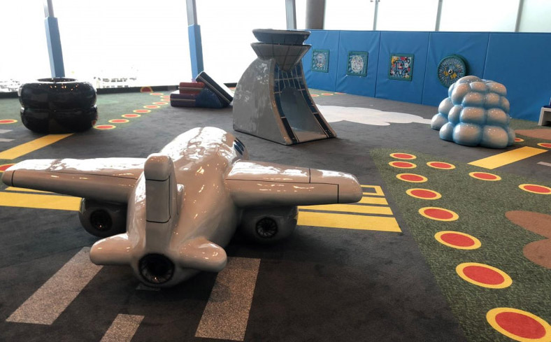 The kids play area in Terminal 1 includes a cloud slide, an airplane on clouds which kids can climb, and a baggage tug with a tunnel. Meanwhile, the kids play area located in Terminal 3 includes an airplane on clouds, resembling the one in Terminal 1, an air traffic control tower with a tunnel, a cloud tunnel, a suitcase slide, and tires for climbing.
