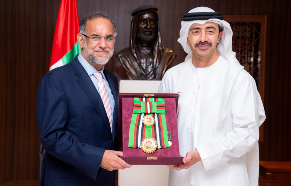 H.H. Sheikh Abdullah presented the Order to the ambassador during a meeting at the ministry in Abu Dhabi on Wednesday, and lauded his role in bolstering UAE-Indian ties and wished him success in his future assignments.