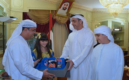 Dana, the 9-year old 'whizkid', presented her spacesuit embroidered with the name of Sheikh Saif, along with the medals she acquired as a gift to Sheikh Saif, in recognition of his unlimited support to reinforce her early emerging talents.