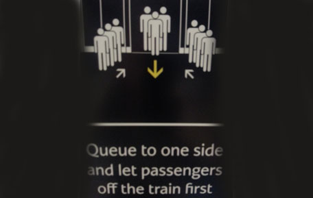 The notices clearly illustrate that people getting off have to leave from the centre of the door, while commuters getting on need to queue on either side of the door and after those getting off are done, can get on.