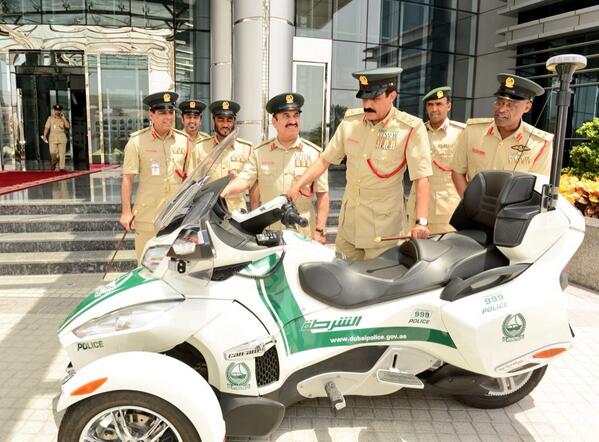 The Superbike, which appears to be a Can-am Spyder, was launched on Monday and will be used for providing security measures in tourist and commercial areas that have narrow street access; it can also be operated as a security specialist even for indoor events, Dubai Police stated.