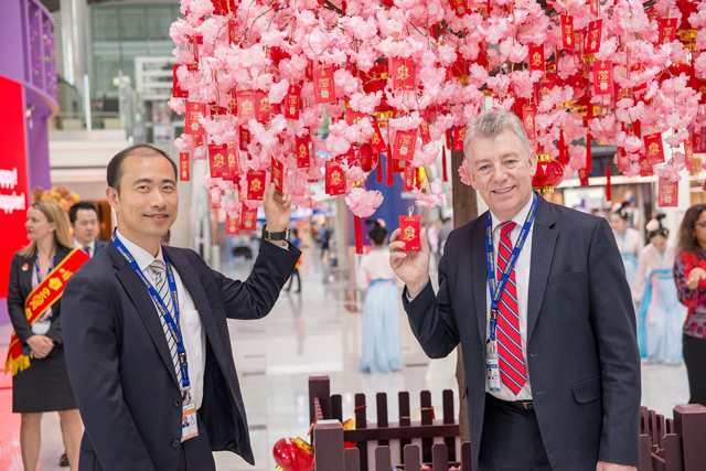 The week-long celebrations were launched on Wednesday at an event at DXB where Paul Griffiths, CEO of Dubai Airports, and Eugene Barry, EVP of Commercial, welcomed Lei Jin, Economic and Commercial Counsellor and Weiyun Deng the Consular Attache from the Consulate General of the People’s Republic of China in Dubai; Li Wang, Director EMEA Ant Financial, Alibaba; Randi Cui the Local General Manager of China Eastern Airlines; Wang Yanming, Local General Manager of China Southern; Gao Zhan, Station Manager of Air China; Jonathan Ng, Local General Manager of Cathay Pacific and Steven Liu, Station Manager of Sichuan Airlines.