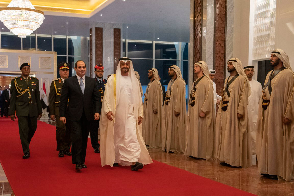 His Highness Sheikh Mohamed bin Zayed Al Nahyan, Crown Prince of Abu Dhabi and Deputy Supreme Commander of the UAE Armed Forces, led an entourage of Sheikhs, ministers and senior officials to welcome the Egyptian leader at the Presidential Flight Terminal at Abu Dhabi International Airport.