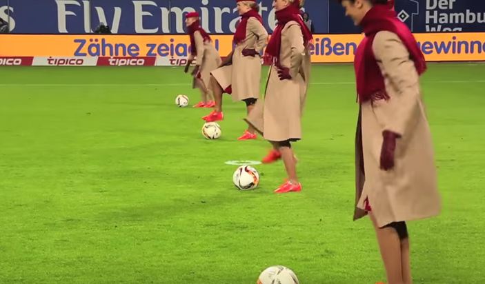 The airline has posted a couple of videos of their cabin crew ‘performing’ for the fans of the German Bundesliga club Hamburger Sport-Verein (HSV), a club that Emirates sponsors.