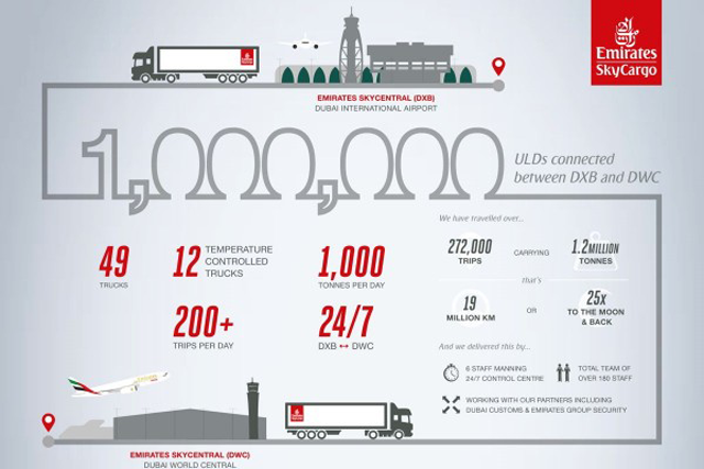 Emirates SkyCargo has announced that it has transported the one millionth Unit Loading Device, ULD, through its bonded corridor trucking service connecting the Dubai International Airport, DXB, and the Dubai World Central, DWC.