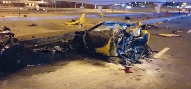 According to Dubai Police, the rented supercar rammed into a lamppost and split into two in the neigbhourhood of Jumeirah Lakes Towers.