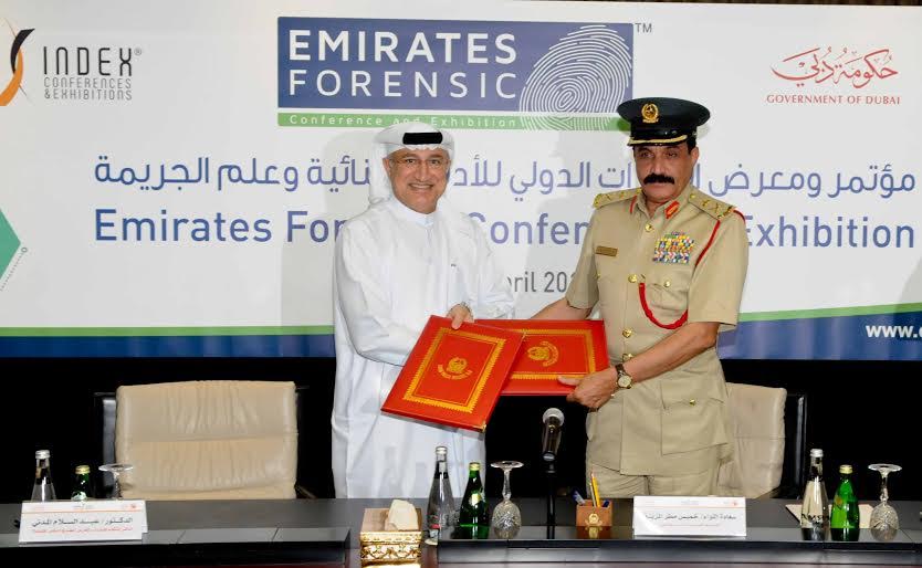 Major General Khamis Mattar Al-Mazeina, Commander in Chief of Dubai Police, and Dr. Abdul Salam Al Madani, Chairman of Index Holding, signed an agreement at the headquarters of Dubai Police to organise the Emirates International Forensic Science Conference and Exhibition in April 2017 at the Dubai International Convention & Exhibition Centre.