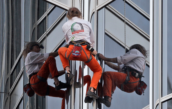 Alain Robert in Abu Dhabi. People watch as Robert easily reaches the top of the National Telecommunications building in 20 minutes