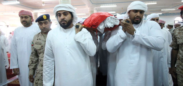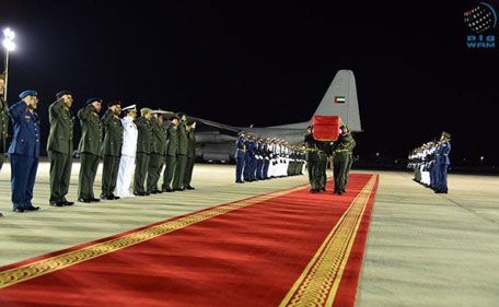 Earlier, the body of martyr Abdullah Juma Hassan Al Shamsi on Sunday arrived at Al Bateen Executive Airport, Abu Dhabi, on board an air force military plane, accompanied by a number of officers and non-commissioned officers of the UAE Armed Forces.