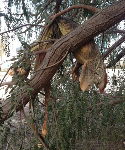 “A neighbour and my husband rushed to the site and chased away the boys. They found eggs smashed in the sand. It took them a while to find the iguana, which was by then dead. It had been disemboweled and was hanging in a nearby tree. My husband removed the body and buried it.”