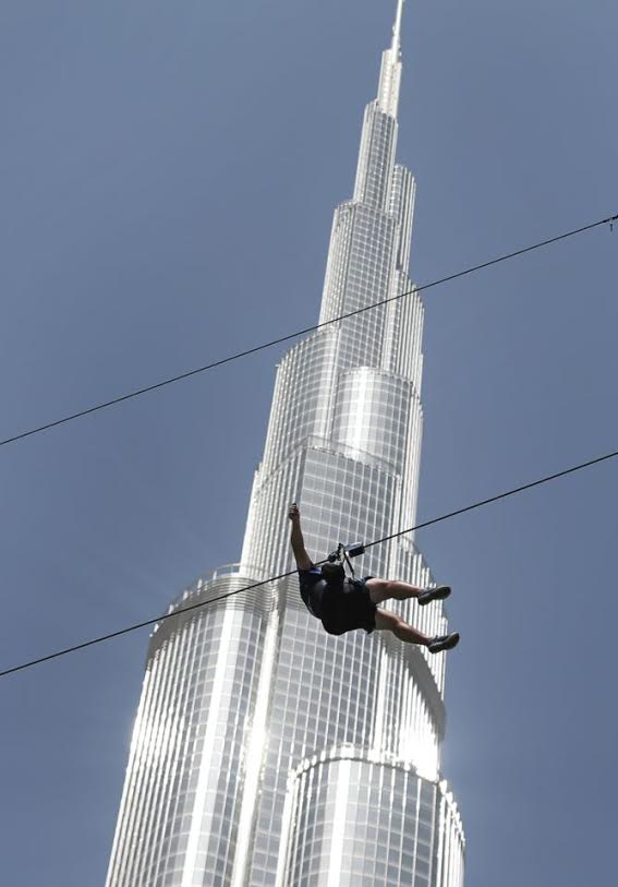 With the world's tallest tower, Burj Khalifa, in background, a man enjoys an urban zip line attraction in Dubai, United Arab Emirates. (AP)