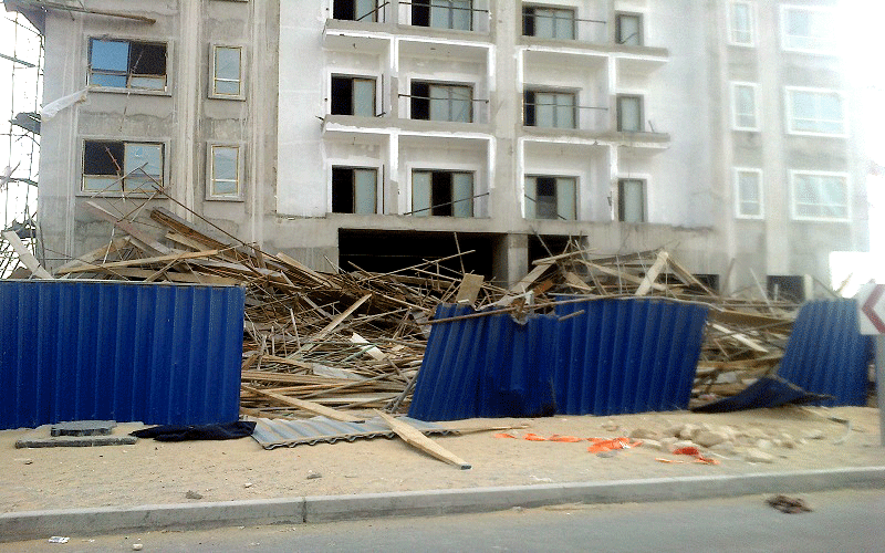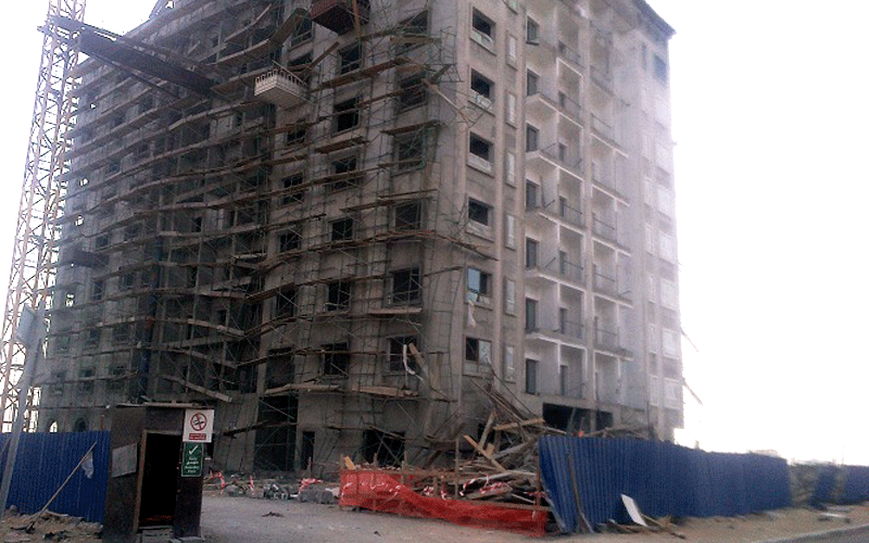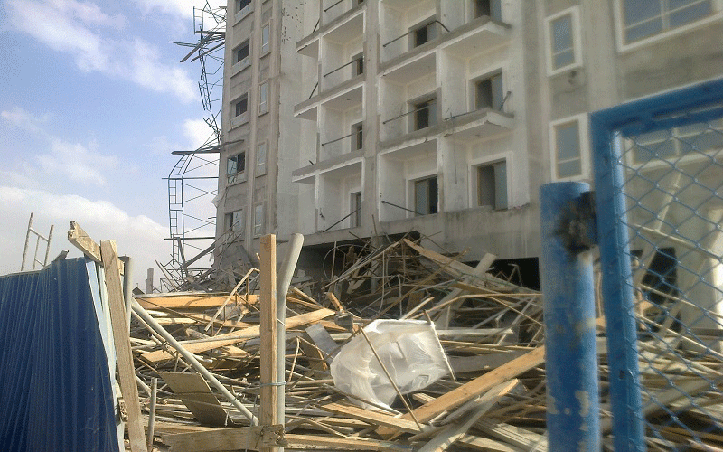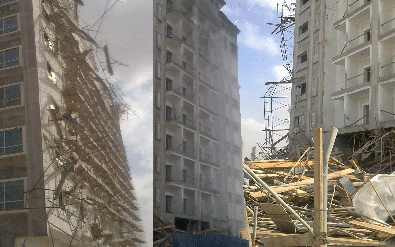 The scaffolding of the under-construction building fell apart, raising concerns about the safety of workers at the site.
