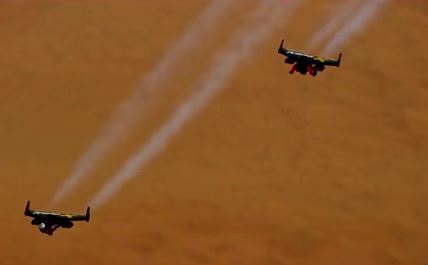 Two started off the stunts in the evening across the desert in Dubai and then into the city flying past Burj Khalifa and Palm Jumeirah.
