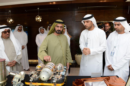 During the visit, Sheikh Mohammed heard from the Emirati experts and engineers about EIAST's plan to build the new Khalifa Sat which will be launch into the outer space. He also viewed plans and designs of facilities for building satellites in 2015.