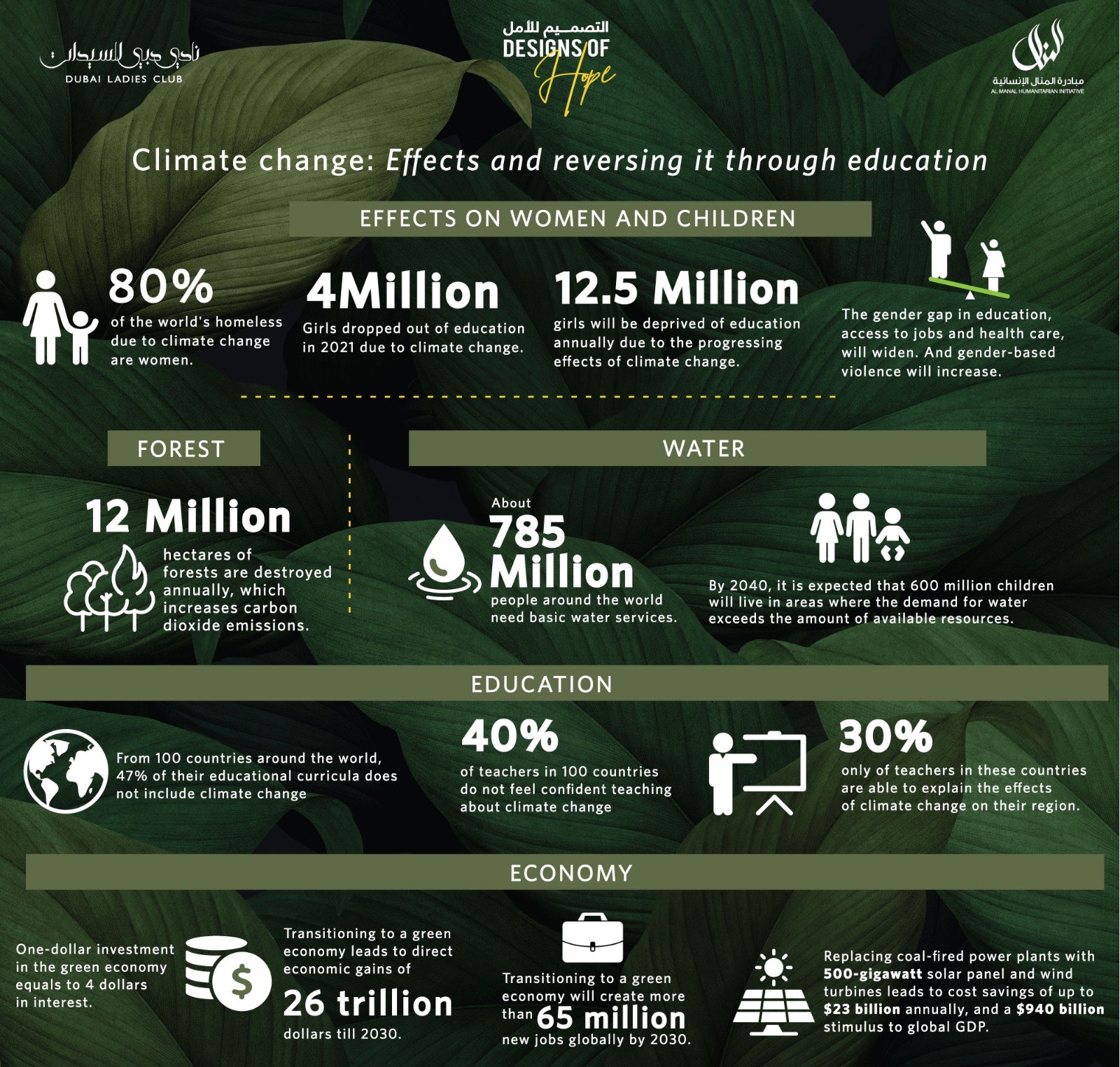 Through its global education transformation efforts, Dubai Cares is emphasising the importance of integrating climate change awareness into the educational system to raise awareness of the adverse effects climate change can have on all developing and developed countries. Such negative implications include the rise of famine, high rate of heat, fires, sea levels, floods, the melting of polar ice, catastrophic storms, the deterioration of biodiversity, as well as the various health effects, especially on children and women. The allocation of the proceeds from the eighth edition of "Designs of Hope" will go towards supporting the integration of climate change issues in education that will contribute to achieving the sustainable development goals related to health, education and gender balance.
