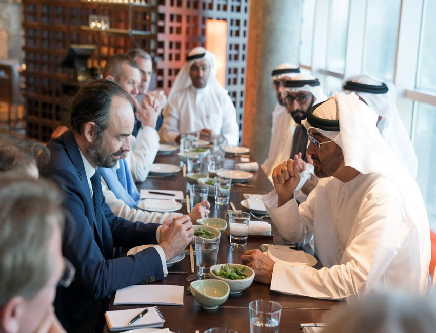 The meeting was attended by Mohammed bin Ahmed Al Bowardi, Minister of State for Defence Affairs; Dr. Ahmed Mubarak Al Mazrouei, Secretary-General of the Abu Dhabi Executive Council; Khaldoon Khalifa Al Mubarak, Chairman of Abu Dhabi Executive Affairs Authority; Mohammed Mubarak Al Mazrouei, Under-Secretary of the Abu Dhabi Crown Prince's Court; Ahmed Ali Al Sayegh, Chairman of the Abu Dhabi Global Market and Omer Saif Ghobash, UAE Ambassador to France.