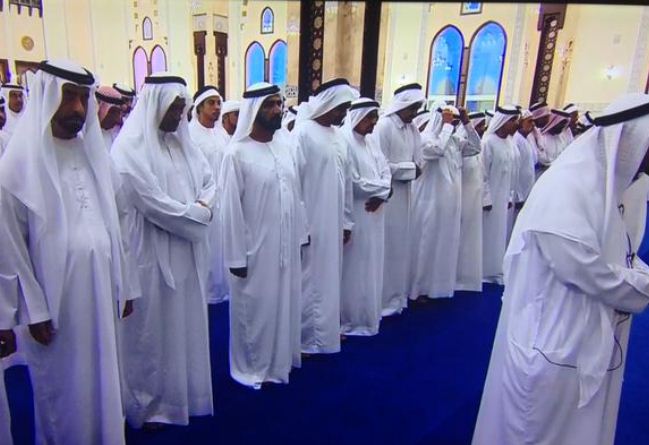 The two prayers were also performed along with both Sheikh Mohammed bin Rashid and Sheikh Mohamed bin Zayed by Sheikh Saif bin Mohammed Al Nahyan, Sheikh Surour bin Mohammed Al Nahyan, Sheikh Hazza bin Zayed Al Nahyan, National Security Advisor and Deputy Chairman of Abu Dhabi Executive Council, Sheikh Nahyan bin Zayed Al Nahyan, Chairman of the Board of Trustees of Zayed bin Sultan Al Nahyan Charitable and Humanitarian Foundation, Lt. General Sheikh Saif bin Zayed Al Nahyan, Deputy Prime Minister and Minister of the Interior, Sheikh Tahnoun bin Zayed Al Nahyan, Deputy National Security Advisor, Sheikh Mansour bin Zayed Al Nahyan, Deputy Prime Minister and Minister of Presidential Affairs, Sheikh Hamed bin Zayed Al Nahyan, Chief of the Abu Dhabi Crown Prince's Court, Sheikh Dhiyab bin Zayed Al Nahyan, Sheikh Omar bin Zayed Al Nahyan, Deputy Chairman of the Board of Trustees of Zayed bin Sultan Al Nahyan Charitable and Humanitarian Foundation, Sheikh Khalid bin Zayed Al Nahyan, Chairman of the Board of Zayed Higher Organisation for Humanitarian Care & Special Needs (ZHO), Dr. Sheikh Sultan bin Khalifa Al Nahyan, Advisor to the UAE President, Sheikh Ahmed bin Saeed Al Maktoum, Chairman of Dubai Civil Aviation Authority and Chairman of Emirates Group, Sheikh Ahmed bin Mohammed bin Rashid Al Maktoum, Chairman of Mohammed bin Rashid Al Maktoum Foundation, Sheikh Saeed bin Mohammed bin Rashid Al Maktoum, Sheikh Mansour bin Mohammed bin Rashid Al Maktoum, Sheikh Mohammed bin Khalifa Al Maktoum, Chairman of Dubai Lands and Property Department, Ahmed Juma Al Zaabi, Deputy Minister for Presidential Affairs, Lt. General Musbeh bin Rashid Al Fattan, Director of the office of Vice-President and Prime Minister and Ruler of Dubai, along with a number of Sheikhs, Al Maktoum Sheikhs, ministers, senior officials and other dignitaries.