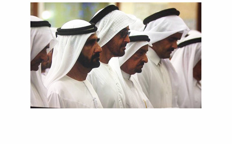 His Highness Sheikh Mohammed bin Rashid Al Maktoum, Vice-President and Prime Minister of the UAE and Ruler of Dubai, and His Highness Sheikh Mohamed bin Zayed Al Nahyan, Crown Prince of Abu Dhabi and Deputy Supreme Commander of the UAE Armed Forces, performed the Maghreb prayer followed by the funeral prayer at Za'beel Mosque, on the body of Sheikh Rashid bin Mohammed bin Rashid Al Maktoum, who died this morning.