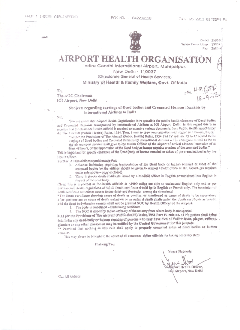 “As per the provisions of the Aircraft (Public Health Rules), 1954 Part IV Rule No 13 to 47 regarding carriage of dead bodies and cremated remains by international airlines, the consignees as well as the air transport service shall give the health officer at the airport of arrival, advance inform at least 48 hours of the importation of the dead body or human remains or ashes.