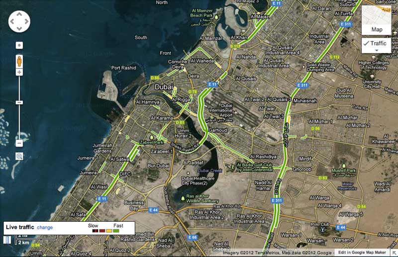 Late on Wednesday, Google Maps announced the launch of live traffic info of the UAE roads whereby drivers can see status of any traffic jams on the roads which will help them plan their route by just clicking on the Google Maps traffic button.