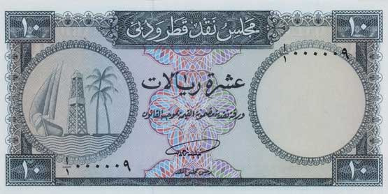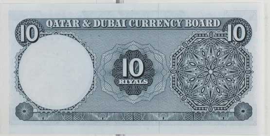 The notes issued by the Qatar & Dubai, Currency Board, were a full set of 1, 5, 10, 25, 50 and 100 Riyals from September 1966, all serial number 000009.