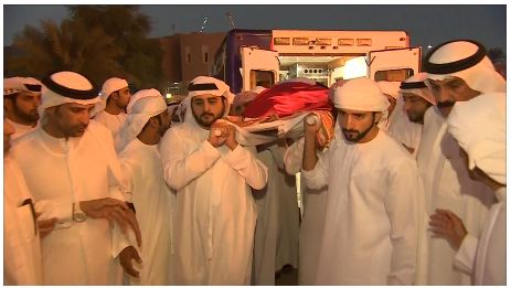 Participants in the funeral procession include Sheikh Hamdan bin Mohammed bin Rashid Al Maktoum, Crown Prince of Dubai; Sheikh Hamdan bin Rashid Al Maktoum, Deputy Ruler of Dubai and UAE Minister of Finance; Sheikh Maktoum bin Mohammed bin Rashid Al Maktoum, Deputy Ruler of Dubai; Sheikh Hazza bin Zayed Al Nahyan, National Security Advisor and Deputy Chairman of Abu Dhabi Executive Council; Sheikh Nahyan bin Zayed Al Nahyan, Chairman of the Board of Trustees of Zayed bin Sultan Al Nahyan Charitable and Humanitarian Foundation; Lt. General Sheikh Saif bin Zayed Al Nahyan, Deputy Prime Minister and Minister of the Interior; Sheikh Tahnoun bin Zayed Al Nahyan, Deputy National Security Advisor; Sheikh Mansour bin Zayed Al Nahyan, Deputy Prime Minister and Minister of Presidential Affairs; Sheikh Hamed bin Zayed Al Nahyan Chief of the Abu Dhabi Crown Prince's Court; Sheikh Dhiyab bin Zayed Al Nahyan; Sheikh Omar bin Zayed Al Nahyan, Deputy Chairman of the Board of Trustees of Zayed bin Sultan Al Nahyan Charitable and Humanitarian Foundation; Sheikh Khalid bin Zayed Al Nahyan Chairman of the Board of Zayed Higher Organisation for Humanitarian Care & Special Needs (ZHO); Sheikh Ahmed bin Saeed Al Maktoum, Chairman of Dubai Civil Aviation Authority and Chairman of Emirates Group; Sheikh Ahmed bin Mohammed bin Rashid Al Maktoum, Chairman of Mohammed bin Rashid Al Maktoum Foundation;Sheikh Saeed bin Mohammed bin Rashid Al Maktoum; Sheikh Mansour bin Mohammed bin Rashid Al Maktoum; as well as sheikhs, ministers, senior officials and dignitaries.