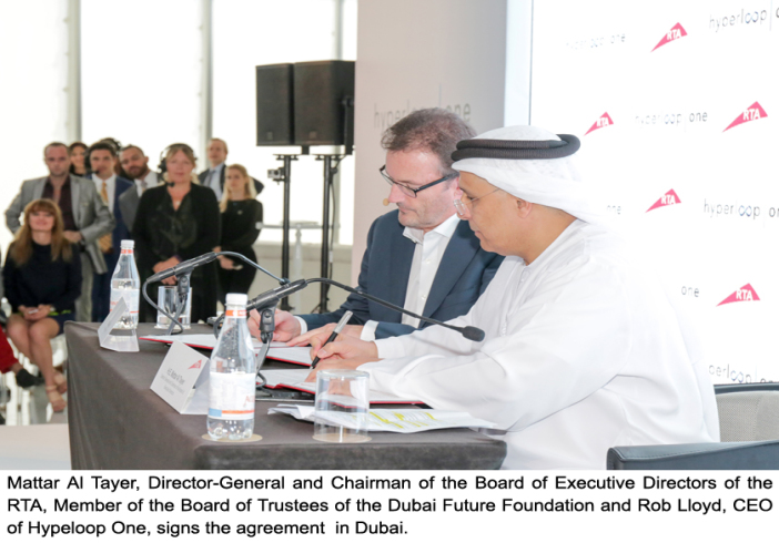 An agreement has been signed between the Roads and Transport Authority, RTA, and Hyperloop One, a global high-speed transport company, here today to work through the Dubai Future Accelerators, DFA, programme and develop a prototype of self-driving cars powered by Hyperloop technology.