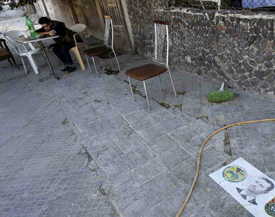 A Free Syrian fighter sits near an image of President Bashar Al Assad in Saif al-Dawla district, in Syria's northwestern city of Aleppo (REUTERS)
